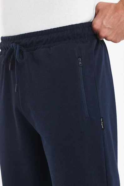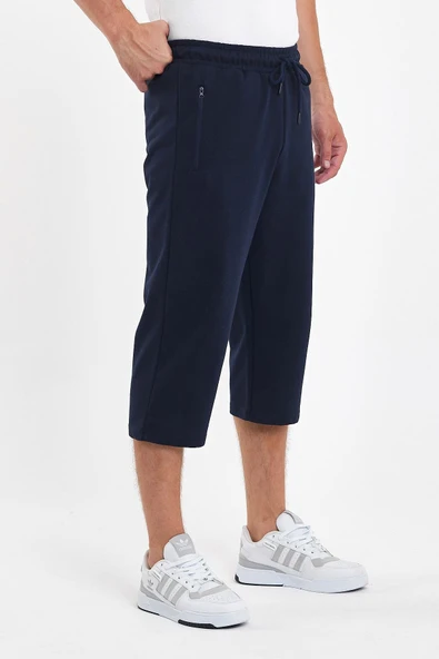 Erkek Cepleri Fermuarlı Lacivert Bermuda Diz Altı Kapri Beli Ayarlanabilir Lastikli Uzun Şort