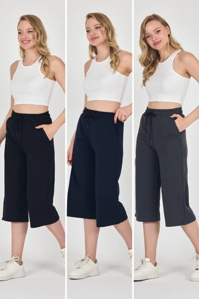 Yüksek Bel Cepli Rahat Kesim Mevsimlik Kadın Diz Altı 3'lü Bermuda Siyah-Lacivert-Antrasit Kapri Şort