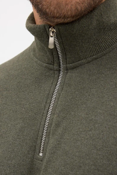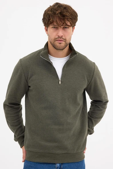 Erkek Haki Standart Fit Normal Kesim Pamuklu Yarım Fermuarlı Dik Yaka Pamuklu Sweatshirt