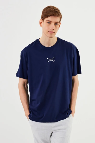 Erkek Bisiklet Yaka T-shirt %100 Pamuk Nakış Detaylı Basic Lacivert Tişört MTLCE89