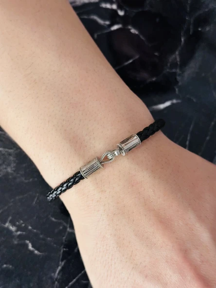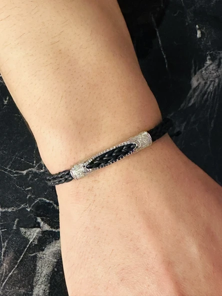 Gümüş Erkek Bileklik ,Beyaz Altın Kaplama, El Örgüsü Deri Kordon,Özel Desen Benzersiz Model Bileklik
