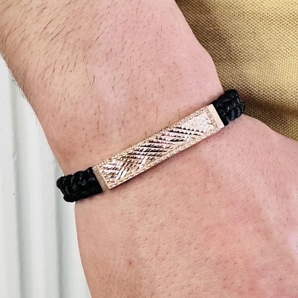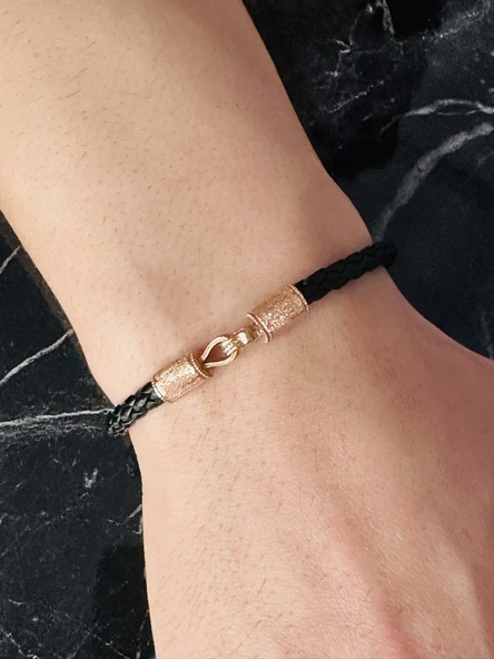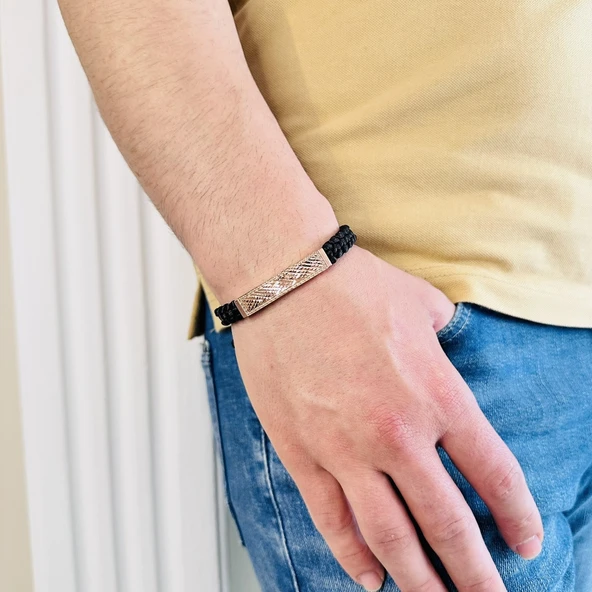 Gümüş Bileklik, Erkek Deri Bileklik, Özel Tasarım Rose Altın Kaplama Işıltı Desen, Şık HEdiye