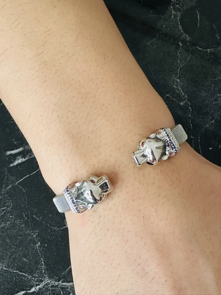 Gümüş Kaplan Başı Erkek Bileklik Mavi Safir Göz, B.Safir Şeritli, Çelik Bant Kararmaz, Şık Bileklik