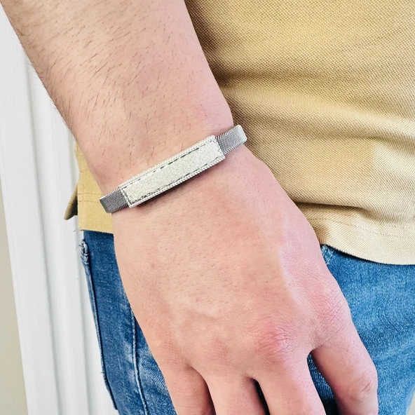 Gümüş Erkek Bileklik 14 Ayar Beyaz Altın Kaplama,Işıltılı Desenli Kararmaz Çelik Bant