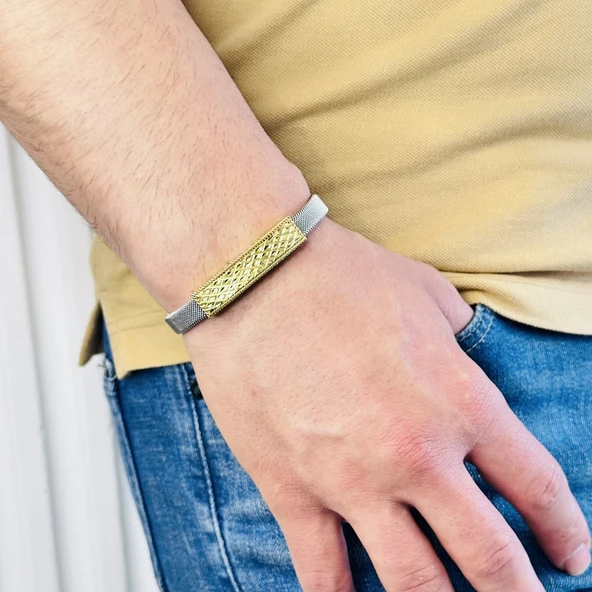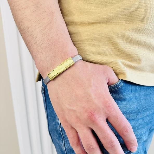 Gümüş Erkek Bileklik 14 Ayar Altın Kaplama,Işıltılı Desenli Kararmaz Çelik Bant