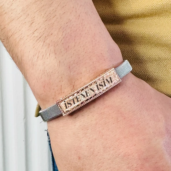 Gümüş Erkek Bileklik ,14k Rose Altın Kaplama,sim Desen Isim Yazılabilir,şık Hediye