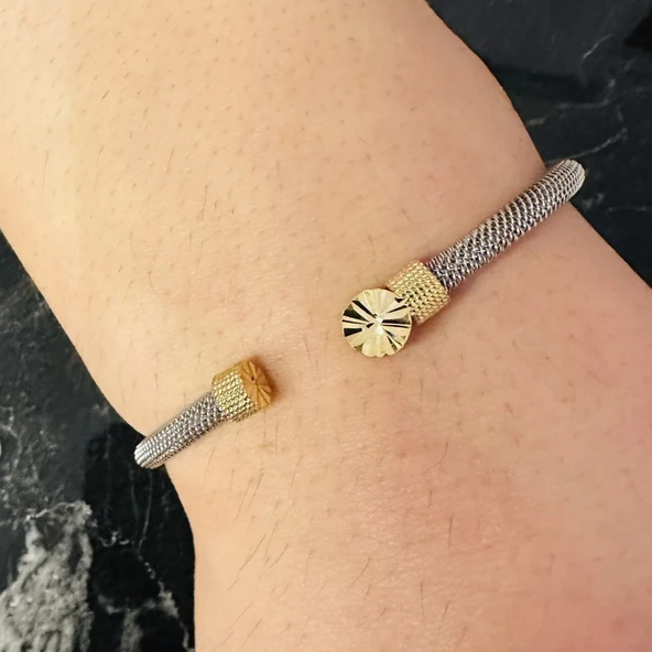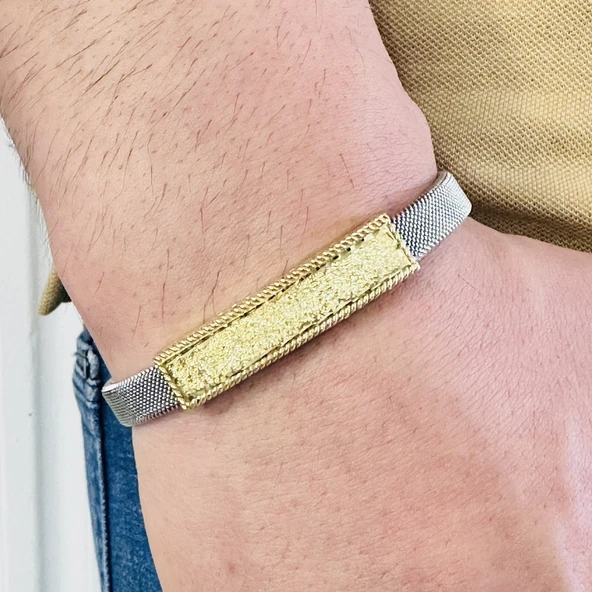 Gümüş Erkek Bileklik 14 Ayar, Altın Kaplama Işıltılı Desenli Kararmaz Çelik Bant