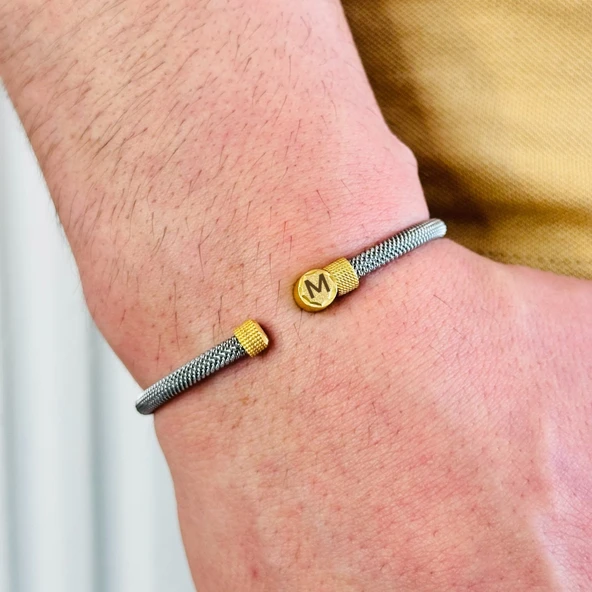 Gümüş Erkek Bileklik,14k Altın Kaplama,ışıltı Desenli Harf Yazılabilir,şık Hediye