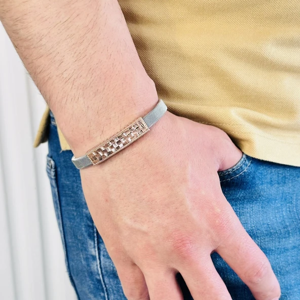 Gümüş Erkek Bileklik,14 Ayar Rose Altın Kaplama,Işıltılı Desenli Kararmaz Çelik Bant