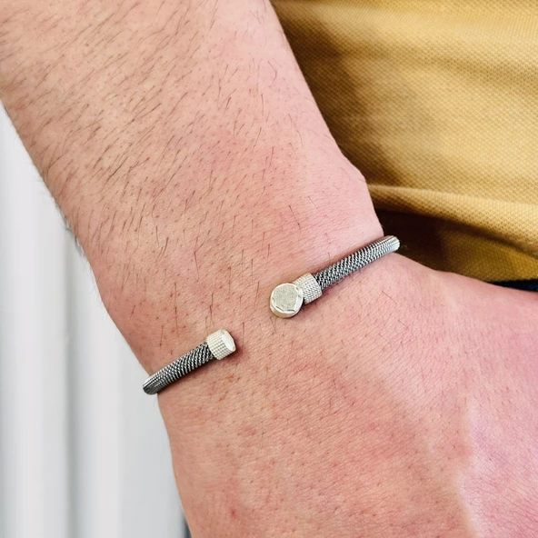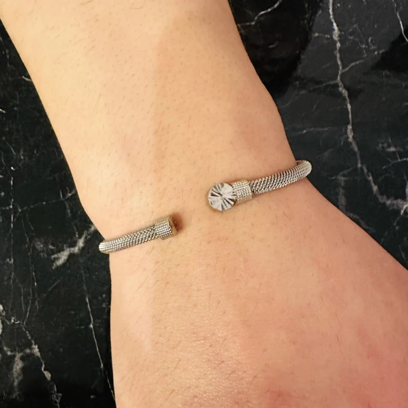 Gümüş Erkek Bileklik,14 Ayar Beyaz Altın Kaplama,Işıltılı Desenli Kararmaz Çelik Bant