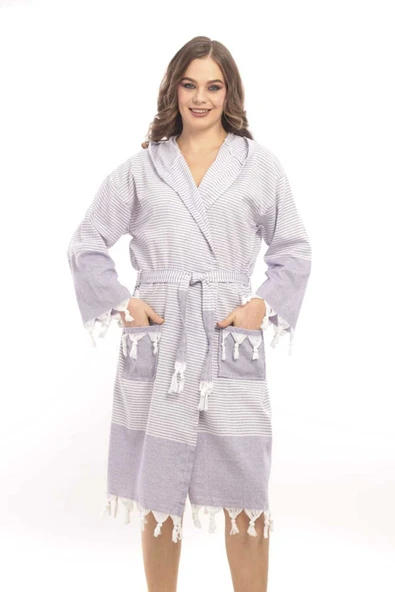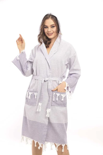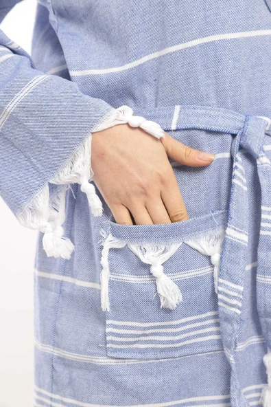 MODEL HOME TEKSTİL Pamuklu mavi renkli kapşonlu peştamal bornoz, sabahlık, plaj elbisesi