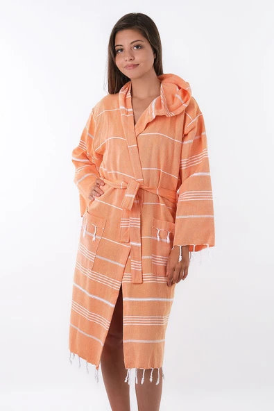 MODELHOME Sultan %100 Pamuklu Turuncu Renkli Kapüşonlu Peştamal Bornoz, Sabahlık Ve Plaj Elbisesi