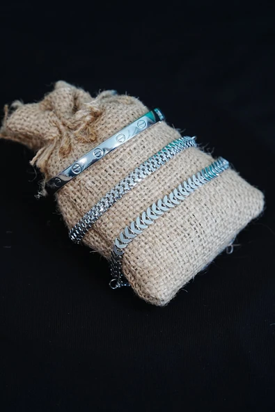 Kombin Bileklik Gümüş Kılçık Tırtıl ve Düz Cırt Model 3 Adet Birden