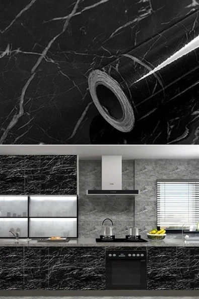BUFFER® Mermer Desenli Masa Tezgah Mutfak Su Geçirmez Yapışkanlı Folyo Sticker Siyah 5x0,6m