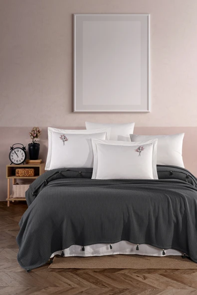 Newhome Çift Kişilik Saçaklı El Nakışlı %100 Pamuk Lüx Pike Takımı Antrasit