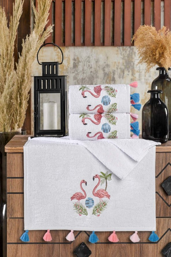 Flamingo Nakışlı Püsküllü 3 lü El Ve Yüz Havlusu