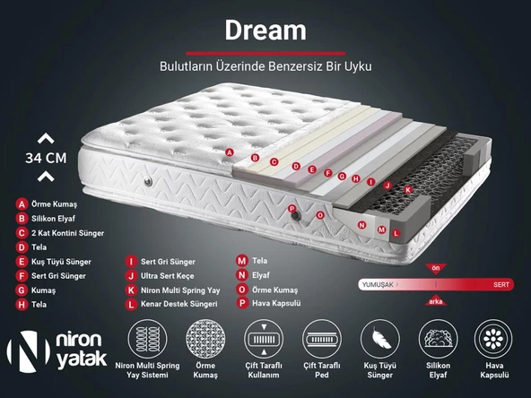 Dream Yatak Çift Pedli Ekstra Lüks Yatak Tek ve Çift Kişilik 34 cm Pamuklu Örme Kumaş