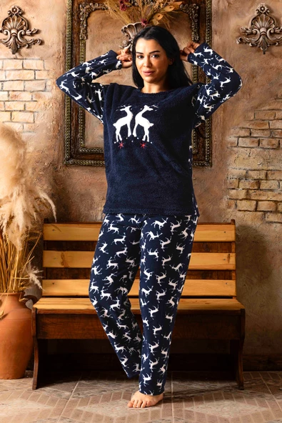 Nisanca Tam Peluş Kışlık Kadın Pijama Takımı- Polar Yılbaşı Pijaması