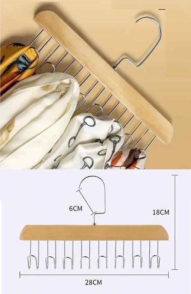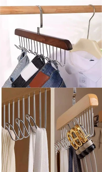 8 Kancalı Askı Çok Fonksiyonlu Ahşap Kemer Kravat Eşarp Dolap Askısı