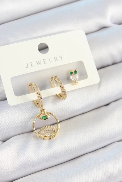 Pirinç Zirkon Taşlı Göz Ve Baykuş Model Gold Renk 3'lü Çift Kadın Küpe Set - TJ-BKP10831
