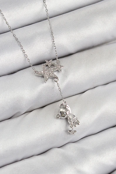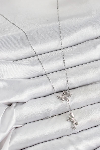 Pirinç Zirkon Taşlı Sallantılı Ayıcıklı Yıldız Model Gümüş Renk Kadın Kolye - TJ-BKO10419