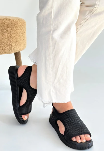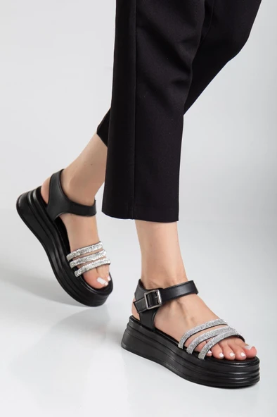 Sinna Siyah Cilt Tül Detaylı Sandalet