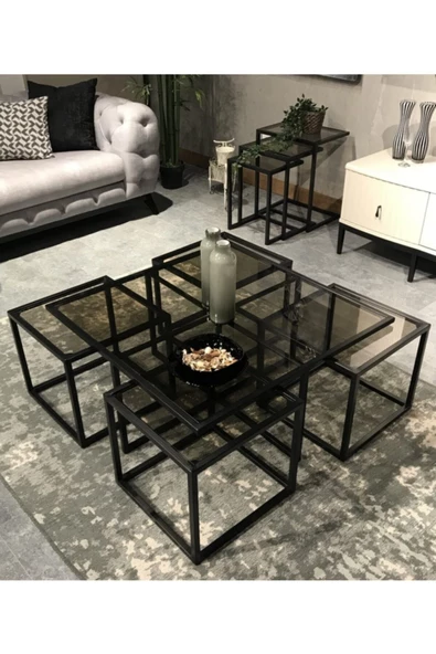 Onurdesign Kante Metal Crom Kaplama Siyah Cam Orta Sehpa 4+1