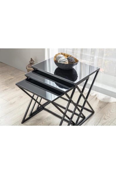 Onurdesign Venedik Metal Siyah Ayak Siyah Cam 3 Lü Içiçe Geçen Zigon Sehpa