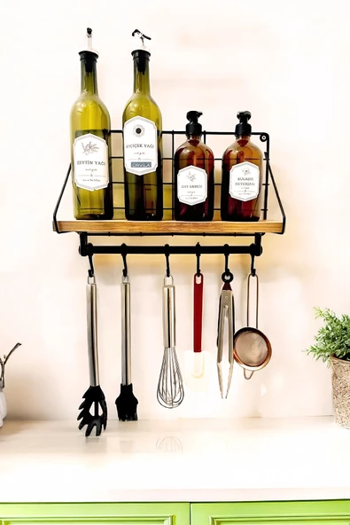 Orvila Orvila Ahşap Standlı Metal Dekoratif Mutfak Rafı - Asılabilir Kancalı 42 cm