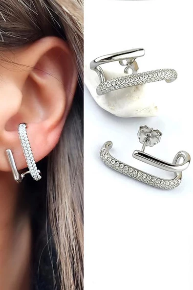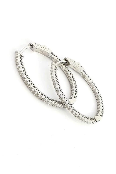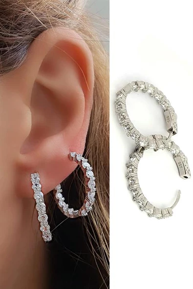 Pırlanta Parlaklığında Zirkon Taşlı 925Ayar Gümüş İçi Dışı Taşlı Halka Küpe