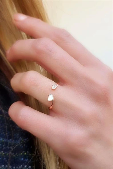 Sedef Taş Detaylı 925Ayar Gümüş Rose Altın Kaplama Ayarlanabilir Kalp Yüzük
