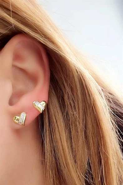 Baget Zirkon Taş Detaylı 925Ayar Gümüş Üzerine Altın Kaplama Kalp Küpe