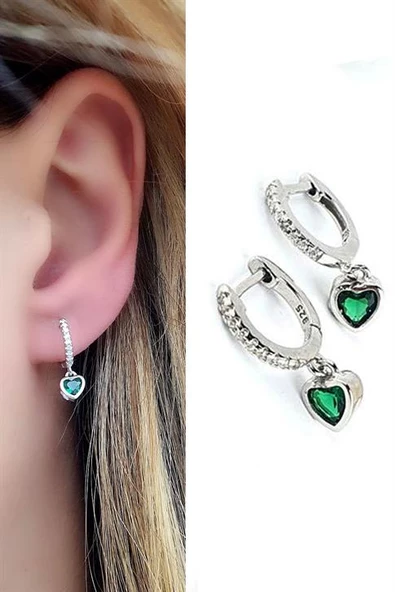 Yeşil Zirkon Taşlı Kalpli 925Ayar Gümüş Minimal Sallantili Halka Küpe