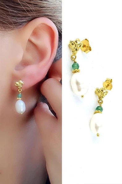 Kök Zümrüt İncili 925Ayar Gümüş Üzerine Altın Kaplama Tasarım Küpe