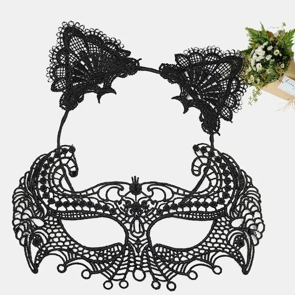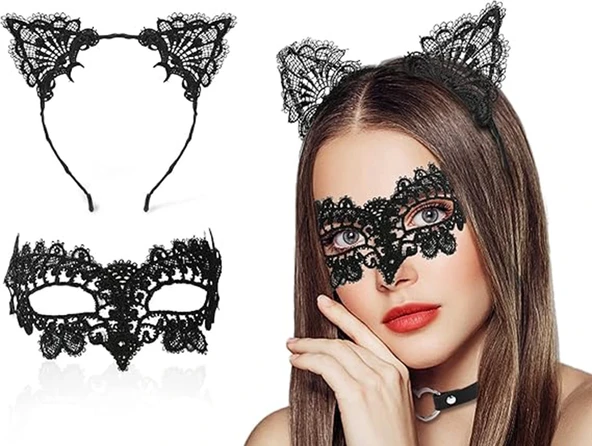 Siyah Renk Dantel Maske ve Dantel Kulak Taç Seti Yetişkin No 10 (5047)