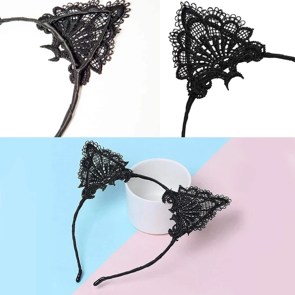 Dantelli Siyah Kedi Tacı - Vintage Tarz Dantel Kedi Kulak