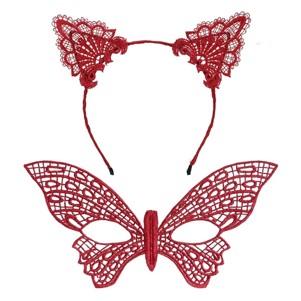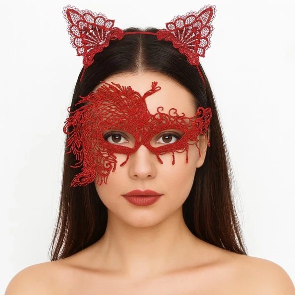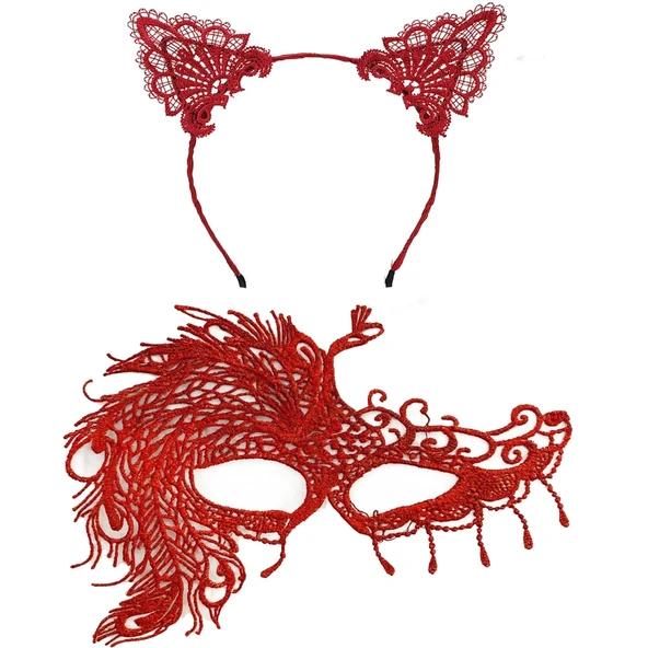 Romantik Kırmızı Dantel Maske Seti - Kedi Kulaklı Taç Ve Maske 3 No