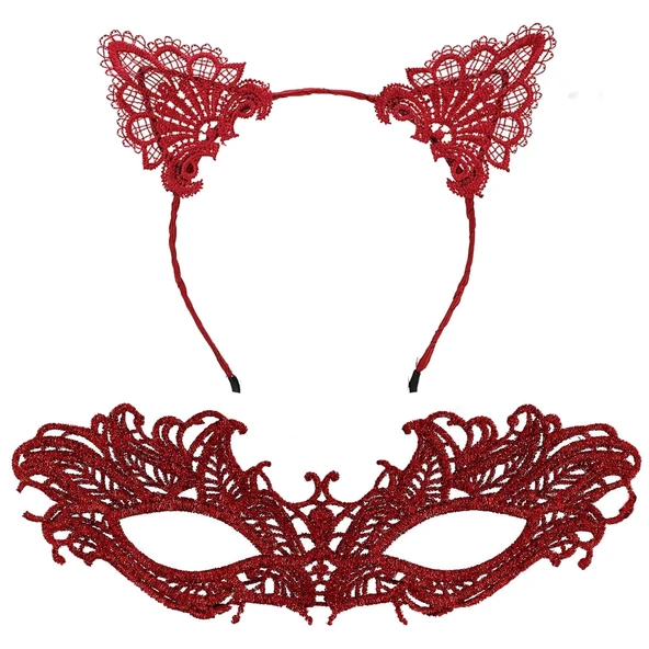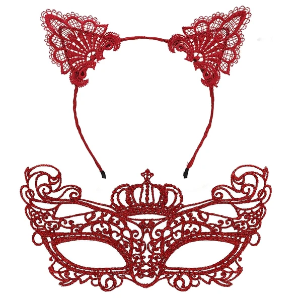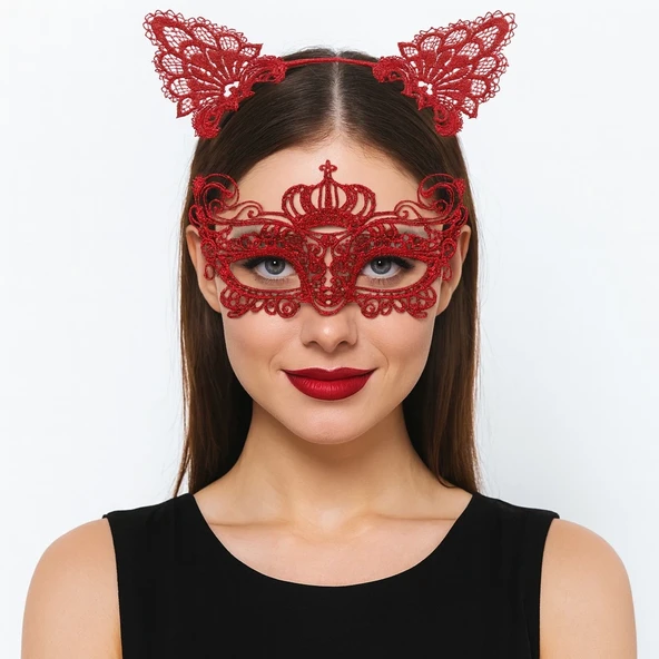 Kırmızı Dantel Kedi Maskesi Ve Dantel Taç Seti - Kadın Kostüm Aksesuarı