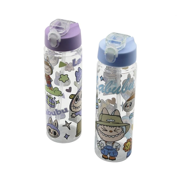 LABUBU ÇOCUK ÇİZGİ FİLM KARAKTER RESİMLİ SU MATARASI ŞEFFAF PLASTİK PİPETLİ KİLİTLİ KAPAK (5047)