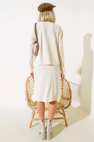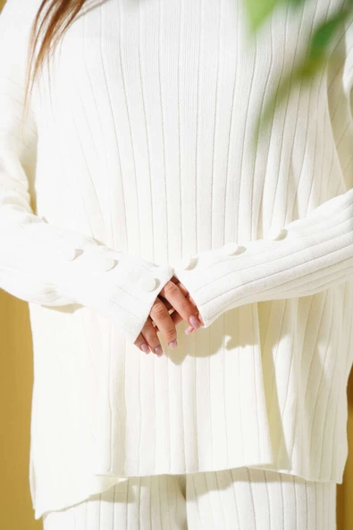Kol Düğme Detaylı Triko İkili Takım Ekru