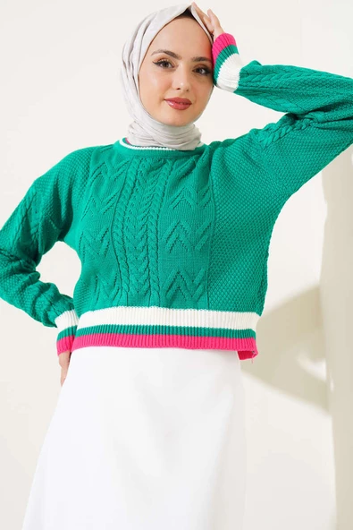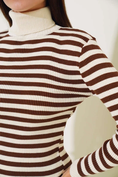 Renkli Kalın Çizgili Triko Crop Kazak Bej