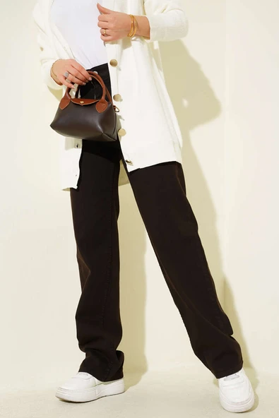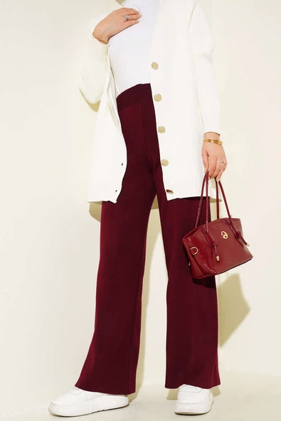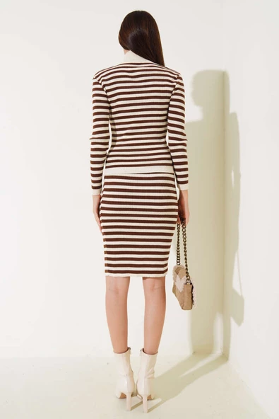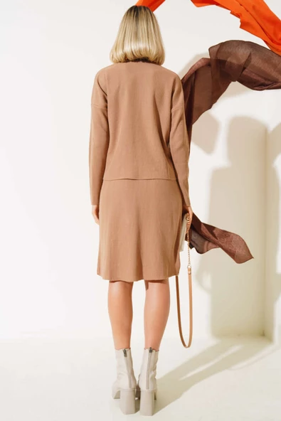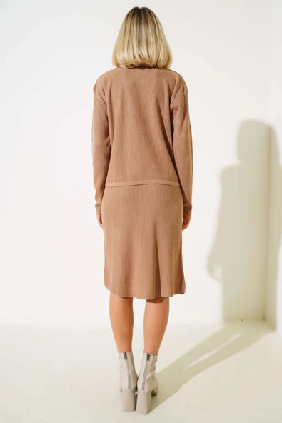 Düğme Detaylı Fitilli Yırtmaçlı Triko Takım Kahve