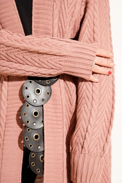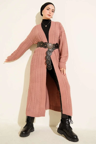 Örgü Büzgülü Uzun Triko Hırka Gül Kurusu