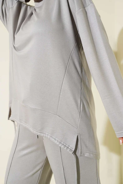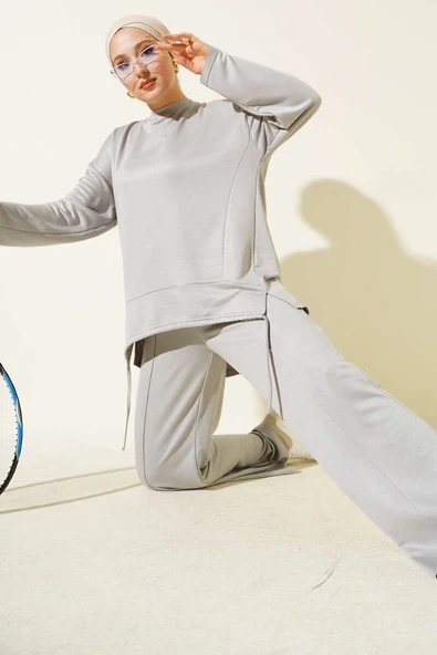 Asimetrik Kesim Bisiklet Yaka İkili Takım Gri