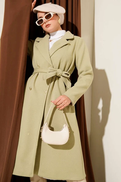 Gold Düğmeli Kuşaklı Kaşe Kaban Su Yeşili