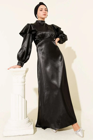 Omuz Fırfırlı Saten Abiye Elbise Siyah