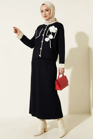 Cep Üstü Gül İşlemeli Etekli İkili Takım Lacivert