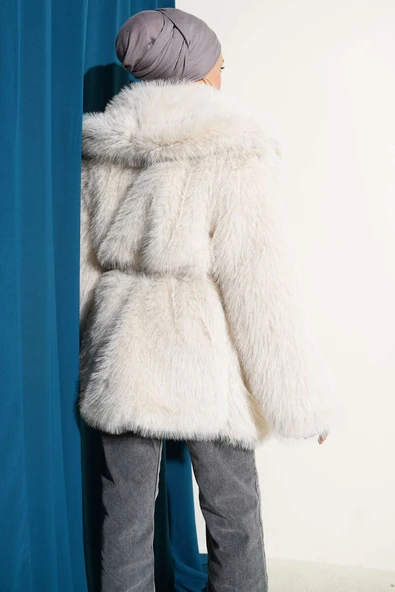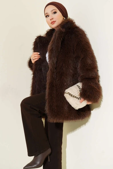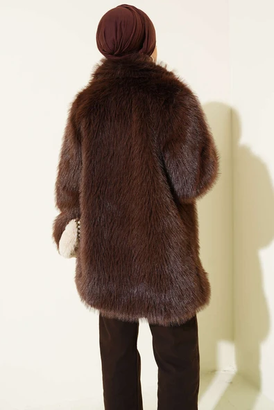Kruvaze Yaka Düğmeli Kürklü Mont Kahve