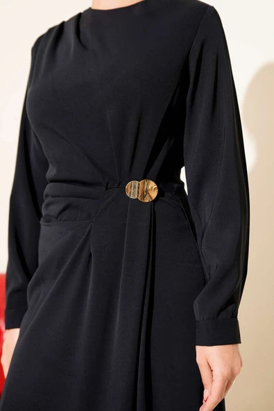 Düğmeli Yandan Bağlamalı Bisiklet Yaka Elbise Bej