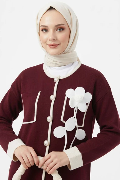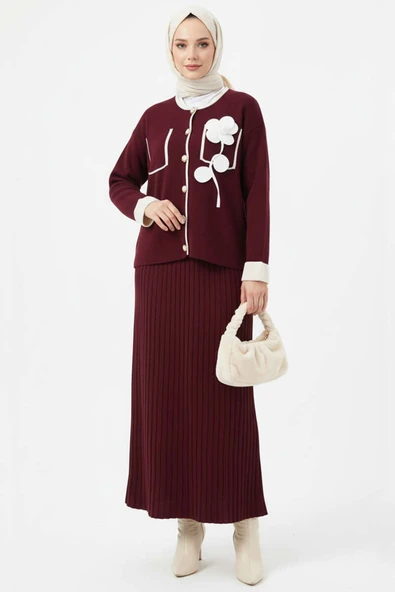 Cep Üstü Gül İşlemeli Etekli İkili Takım Bordo